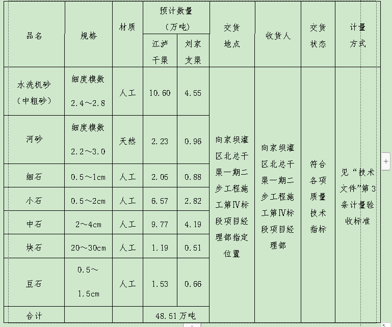 向家壩灌區(qū)北總干渠一期二步工程施工第Ⅳ標段砂石采購清單