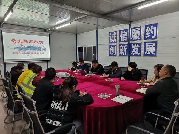 第五分公司黨支部在大竹縣土地灘水庫樞紐及補(bǔ)水工程項(xiàng)目部召開黨史學(xué)習(xí)教育專題會(huì)(2021.03.18)