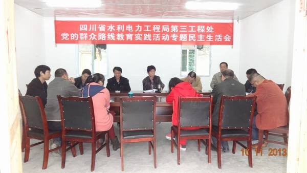 2013年11月10日下午,第三工程處在宜賓市筠連縣后溝水庫項目部召開了黨的群眾路線教育實踐活動專題民主生活會。局黨委副書記、紀委書記高本祥,勞動人事處處長舒建國,黨辦主任夏永紅到會指導。三處班子成員參加會議,后溝水庫項目部黨員職工及各科室主要負責人列席會議。會議由三處黨支部副書記周加利主持。