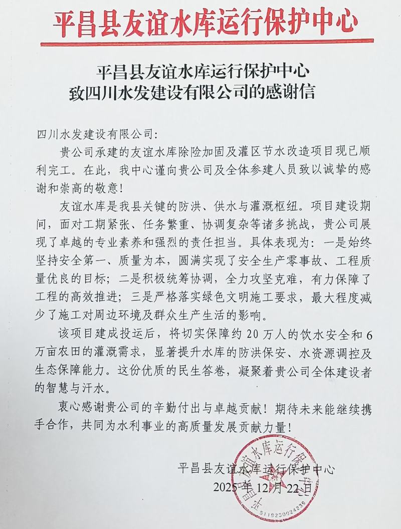 此次獲贈錦旗與感謝信,既是對公司項目團隊辛勤付出的充分肯定,也是對“川水善建映初心”品牌實力與企業擔當的贊譽。公司繼續堅守“服務水利事業、保障民生福祉”的國企責任,弘揚鐵軍精神,為推動區域水利事業發展再立新功。