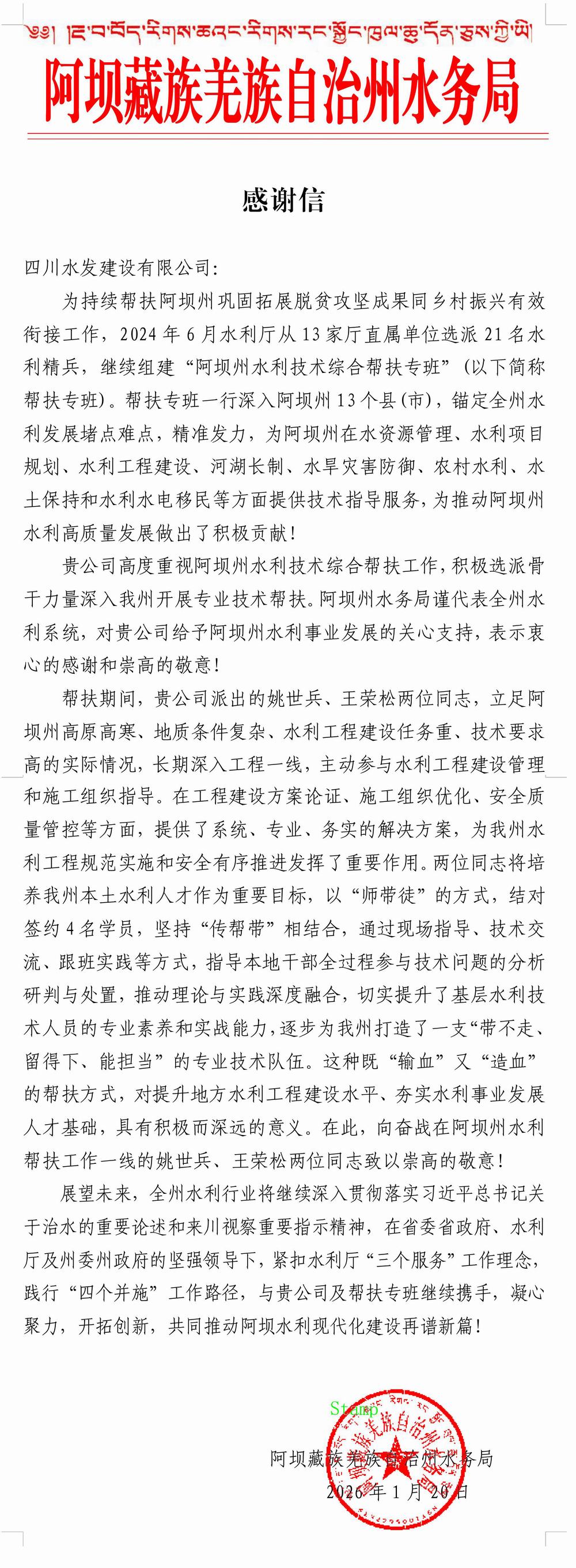 近日,公司收到阿壩藏族羌族自治州水務局的感謝信,信中對選派姚世兵、王榮松兩位技術骨干參與當地水利技術綜合幫扶表示高度贊揚,并對公司重視幫扶工作、支持阿壩州水利事業發展致以衷心感謝與崇高敬意。