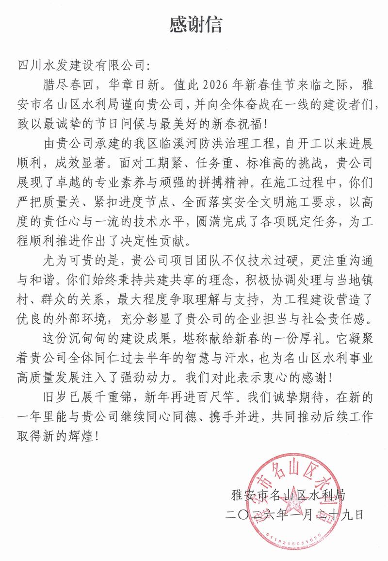 近日,公司收到來自雅安市名山區(qū)水利局的感謝信。信中對公司承建的臨溪河防洪治理工程給予高度評價,并向公司及全體一線建設者致以誠摯的新春問候與美好祝福。