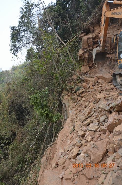 我局承建的老撾南桑3級(jí)進(jìn)場公路工程位于老撾華潘省境內(nèi),公路全長3596.004m,工程建設(shè)期為4個(gè)月,在老撾雨季前必須完成所有施工任務(wù)。承擔(dān)建設(shè)任務(wù)的第四工程處組織精干力量,于2015年1月24日迅速組織首批人員進(jìn)場,并緊急抽調(diào)我局原老撾色薩拉龍灌溉項(xiàng)目停留機(jī)械設(shè)備共23臺(tái)套,組織中方及老撾本地員工35人于2月7日開始進(jìn)行主體工程施工,由于工程合同簽訂時(shí)未對(duì)施工現(xiàn)場進(jìn)行勘查,僅僅依靠設(shè)計(jì)圖紙進(jìn)行綜合考慮,在實(shí)際施工過程中遭遇到諸多困難:一是設(shè)計(jì)軸線與實(shí)際地形差異較大,沿線山體陡峭,沖溝及陡崖沿線分布較多,許多開挖地段山體傾角呈70—80度甚至局部呈90度,作業(yè)人員難以在山坡立足,沿線多出現(xiàn)陡崖、沖溝等斷頭及懸空現(xiàn)場;二是開挖高度較高,最高開挖高度超過45米,其他開挖高度大多在10米以上,而且山體覆蓋層較薄, 90%為基巖,挖機(jī)在開挖過程中難以形成有效的可操作平臺(tái),必須邊開挖邊爆破再開挖,并及時(shí)處理高邊坡處危巖方可再前進(jìn),局部地段只能采取液壓鉤機(jī)作業(yè)才能保證挖機(jī)繼續(xù)前進(jìn);三是巖石堅(jiān)硬、節(jié)理及裂隙發(fā)育,鉆爆難度較大,打鉆常有卡鉆現(xiàn)象,部分地段只能采用液壓鉤機(jī)開挖;四是開挖作業(yè)面狹窄單一,由于道路軸線大多沿山體中部前進(jìn),無法開展多點(diǎn)施工作業(yè)面,只有采取一臺(tái)挖機(jī)單向開挖毛坯路,而后另一臺(tái)挖機(jī)隨后再進(jìn)行降高處理,降高過程中挖機(jī)需要進(jìn)行多次翻甩作業(yè),增加了施工作業(yè)程序,因此施工過程十分困難;五是由于該項(xiàng)目地處老撾原始森林未開發(fā)地帶,山體植被豐富茂密,樹木粗大密集,挖機(jī)在開挖過程中遇粗大樹木無法直接挖除時(shí),必須采取鋼絲繩牽拉、人工鋸除甚至個(gè)別極其粗大樹木只有采取爆破作業(yè)才能保證開挖作業(yè)正常進(jìn)行。六是工程所需炸材手續(xù)因老撾國家程序較繁瑣,辦事效率較低,嚴(yán)重影響工程進(jìn)度。加上老撾當(dāng)?shù)匚镔Y匱乏,許多工程配件需要國內(nèi)發(fā)送,其發(fā)送周期較長影響工程進(jìn)度。
