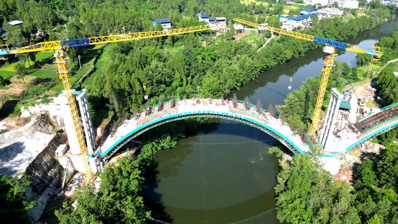 構溪河渡槽位于閬中市石灘鎮境內構溪河上,渡槽全長708m,最大架空高度達53m,是全線重點控制性工程。為保障施工順利推進,項目團隊多措并舉克服高空作業風險大、技術要求高、大跨度拱圈澆筑難、持續高溫紅色預警等多項挑戰,堅守“內斂堅韌,勇毅篤行”企業精神,以“科學規范、集約高效”的精細化管理,統籌抓好質量、安全、進度、成本四大關鍵環節管控;創新采用“選擇代表性拱跨預壓”工藝,有效控制結構變形;嚴格遵循“縱向分段、豎向分環”的澆筑方案,確保拱圈受力均勻和線形精準;加強數字化監管賦能全流程預警與閉環監管,最終安全、優質、高效完成合攏。