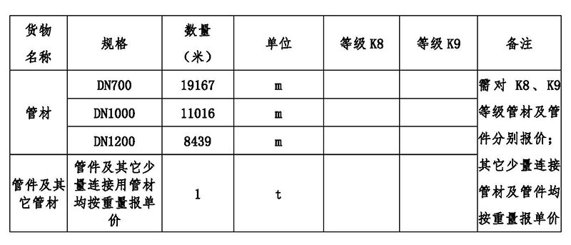 采購范圍:球墨鑄鐵管(管徑DN700-1200)及管件,總用量約38622米。采購數量以實際需求數量為準。